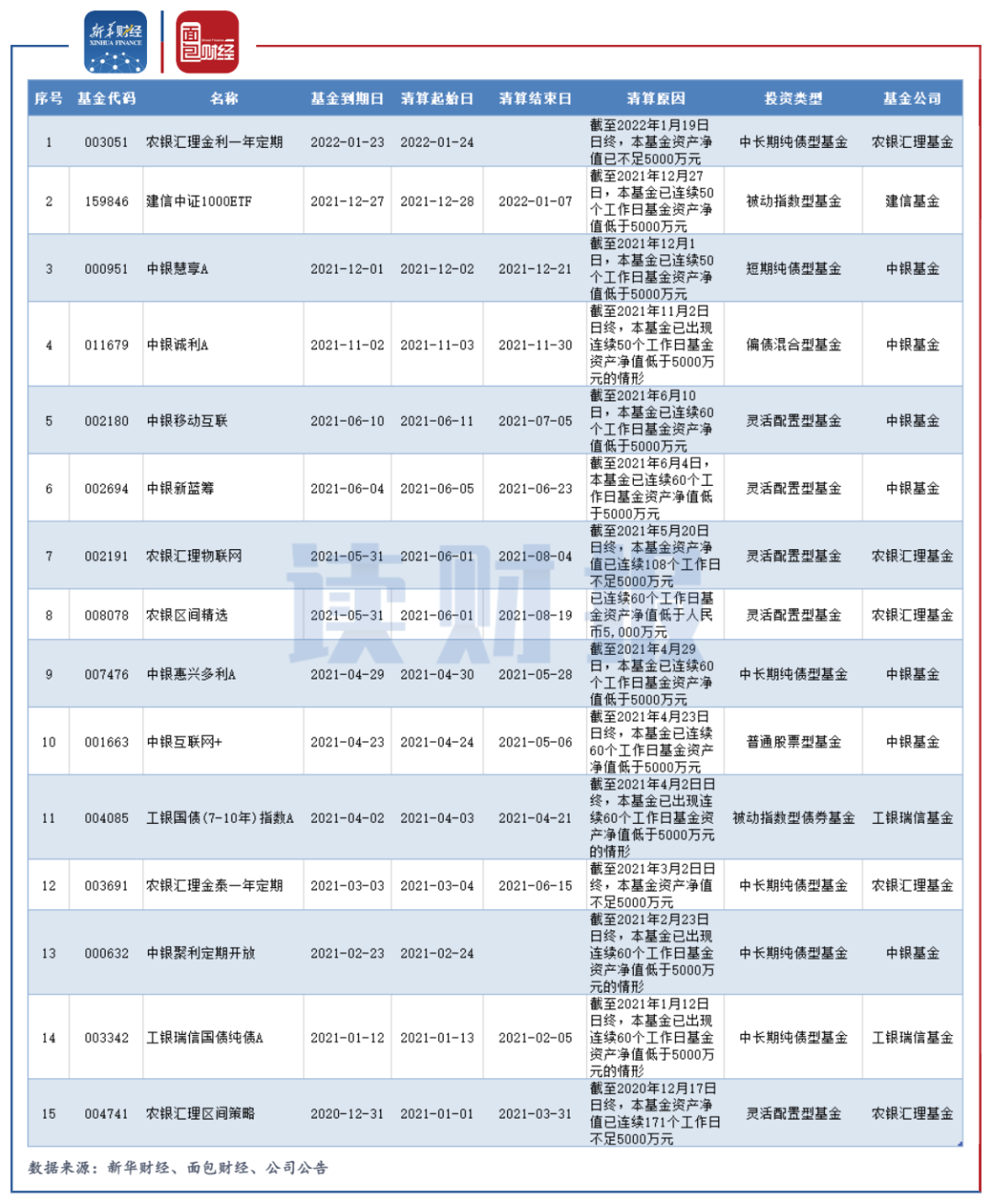 近期,農銀匯理旗下產品“農銀匯理金利一年定期”因資產凈值跌至5000萬元以下觸發終止條款,自2022年1月24日起進入清算程序。剛剛過去的牛年,國有五大行旗下基金公司共有13只產品因基金規模不足5000萬元而被清算。