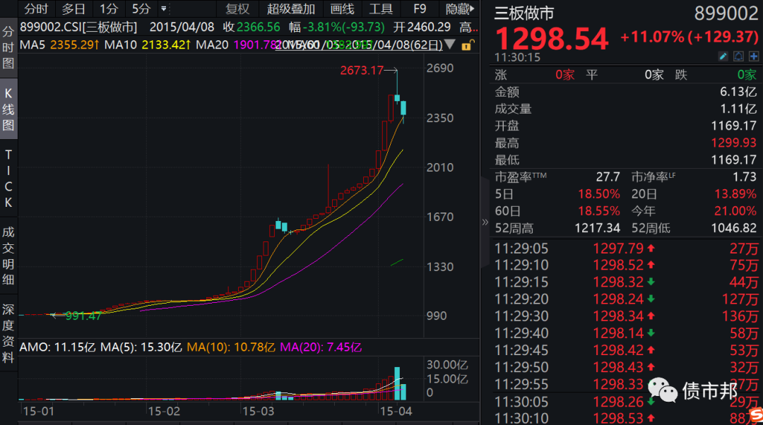 資金的瘋狂涌入,使得三板相關指數以一個45度角的斜率不帶調整的猛漲,2015年3月一個月的時間,三板做市指數實現翻倍,同期A股最猛的創業板指不過上漲了21.12%。