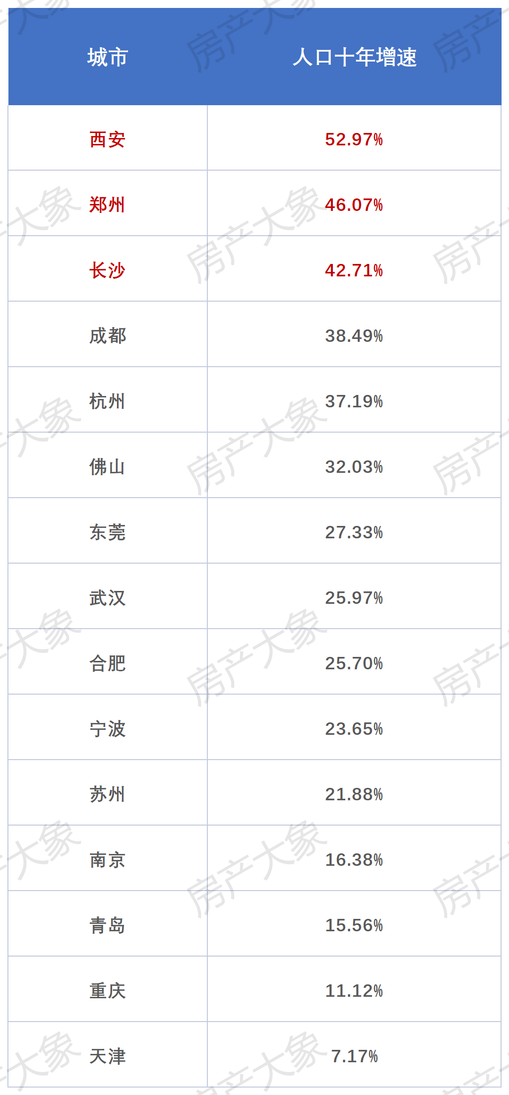 從十年常住人口增速看,西安以52.97%的增速排名第一;鄭州第二,46%;長沙第三,42.7%;成都38.5%,杭州37.2%,人口紅利依然存在。