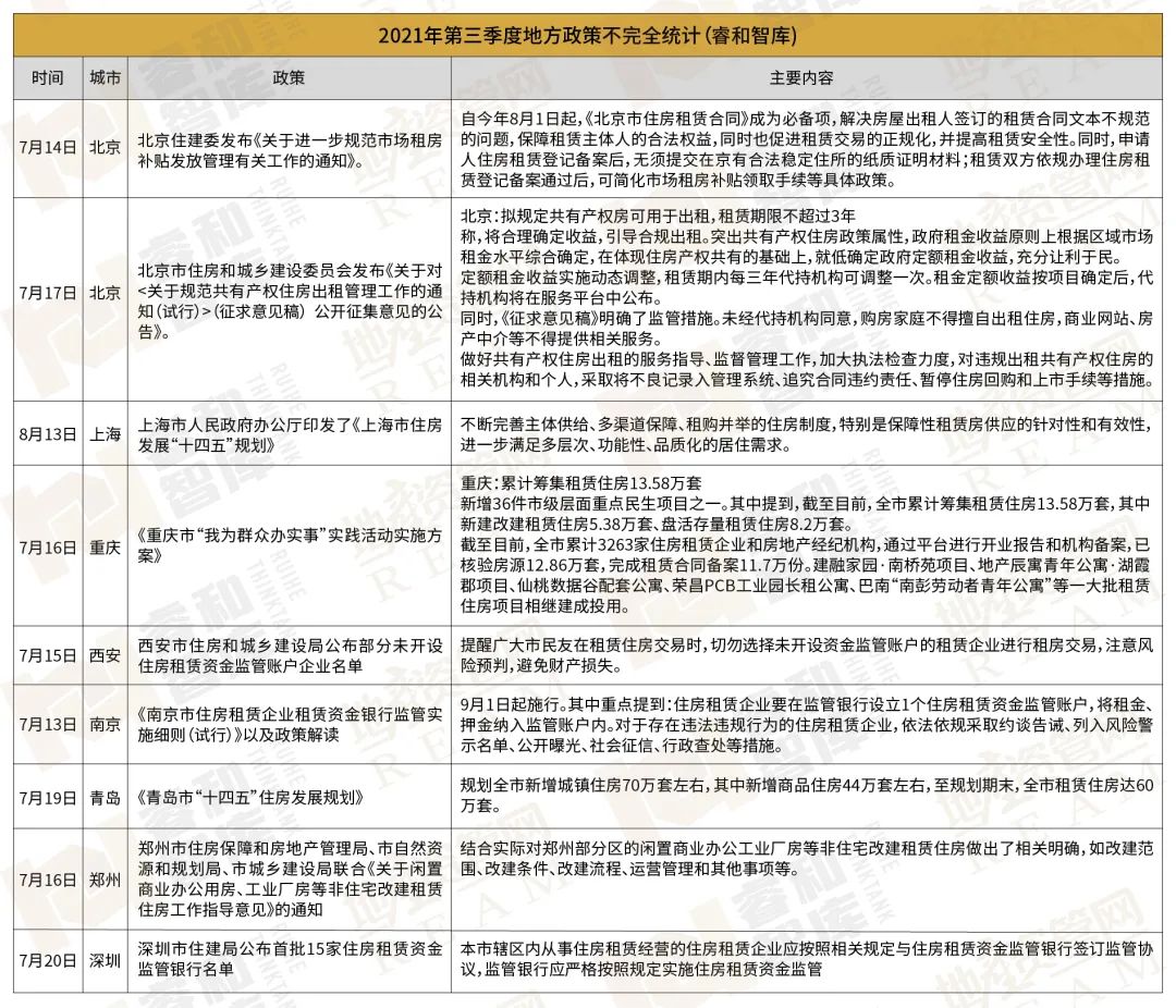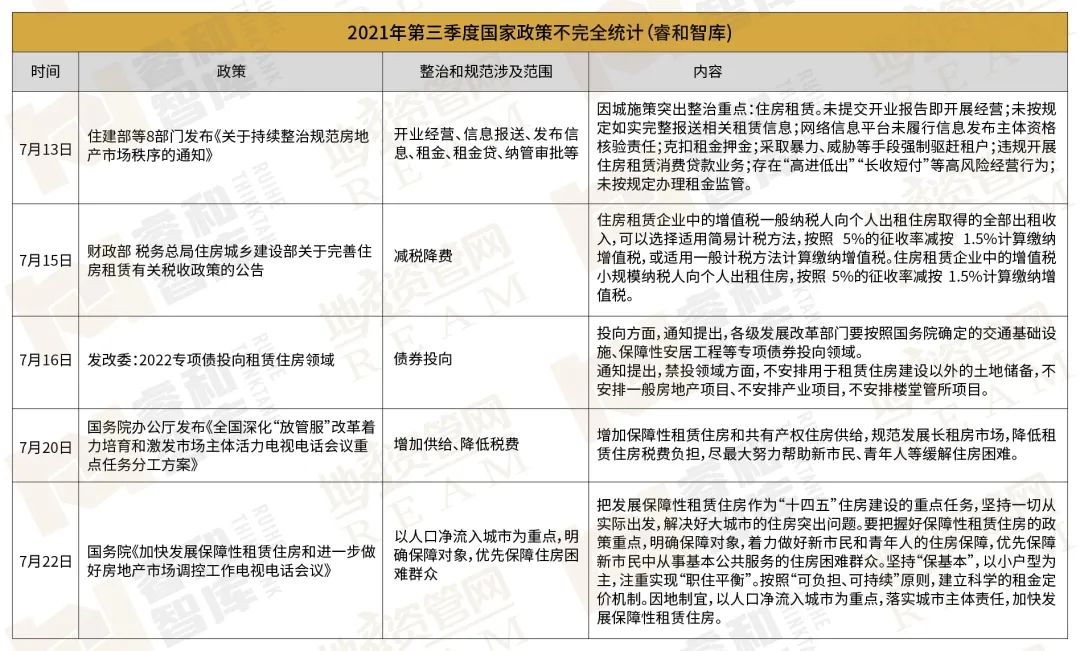 黨的“十九大”報告明確提出要加快建立多主體供給、多渠道保障、租購并舉的住房制度。2021年以來,土地、稅費(fèi)等多維度利好政策頻頻推出。睿和智庫以2021年第三季度為周期進(jìn)行了部分梳理。