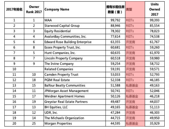 從模式看,數(shù)據(jù)顯示,美國2017年擁有長租住房數(shù)量排名前20的住房租賃企業(yè)具有以下特點(diǎn):住房租賃企業(yè)以REITs和開發(fā)商為主, 前20的企業(yè)均為重資產(chǎn)運(yùn)營商。