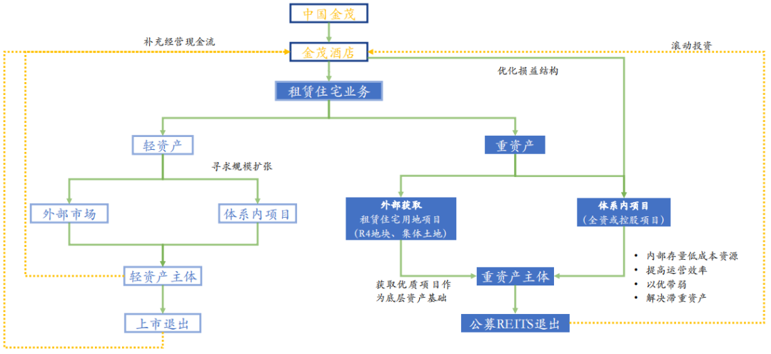 如何輕重結(jié)合?以金茂為例,公寓業(yè)態(tài)優(yōu)先尋求規(guī)模擴(kuò)張,夯實底層重資產(chǎn)基礎(chǔ),并在形成現(xiàn)金流的基礎(chǔ)上,提升體系內(nèi)滯重資產(chǎn)的運(yùn)營效率,并將滿足條件的體系內(nèi)自持部分裝入重資產(chǎn)主體,構(gòu)建公募REITs底層資產(chǎn), 打通投融管退全生命周期。