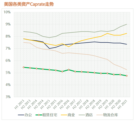 從2013年至今美國各類資產(chǎn)資本化率走勢來看,單看美國REITs市場規(guī)模和收益率走勢,除了IDC、物流資產(chǎn)之外,投資人對長租公寓的投資一直處于上升趨勢。