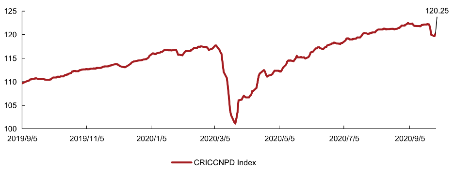 為了更好地展示房企融資的市場表現(xiàn),克而瑞委托倫敦證券交易所集團(tuán)(LSEG)的全資子公司:富時(shí)羅素經(jīng)過嚴(yán)格篩選,挑選出具有代表性的中資房地產(chǎn)美元債進(jìn)行編制了克而瑞中國地產(chǎn)債券領(lǐng)先指數(shù)。截止至2020年9月29日,該指數(shù)相比9月21日高點(diǎn)小幅回調(diào)至120.05,中資地產(chǎn)美元債在一季度疫情后,隨著二季度的復(fù)工復(fù)產(chǎn),房地產(chǎn)行業(yè)快速復(fù)蘇,美元債的市場表現(xiàn)也有明顯的回彈,近期呈現(xiàn)穩(wěn)健上行的態(tài)勢。