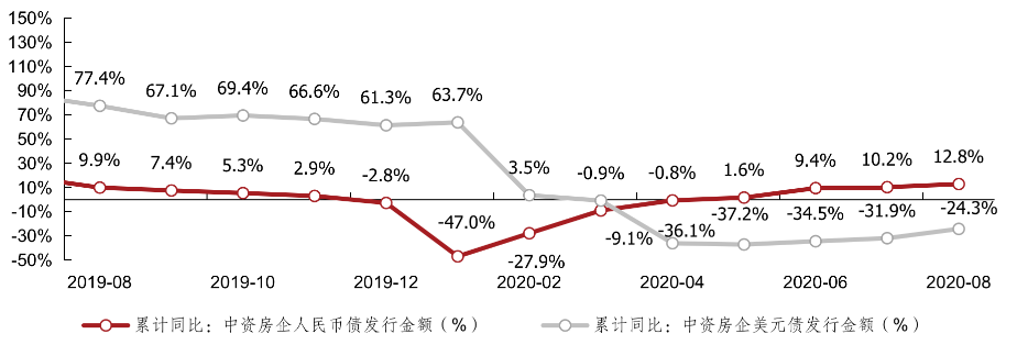 綜合1-8月中資房企總計(jì)發(fā)行美元債466.2億美元,相當(dāng)于3251.8億元人民幣,同比下降24.3%;總計(jì)發(fā)行人民幣債7661.6億元人民幣,同比上升12.8%。境內(nèi)外融資狀況均進(jìn)一步改善。