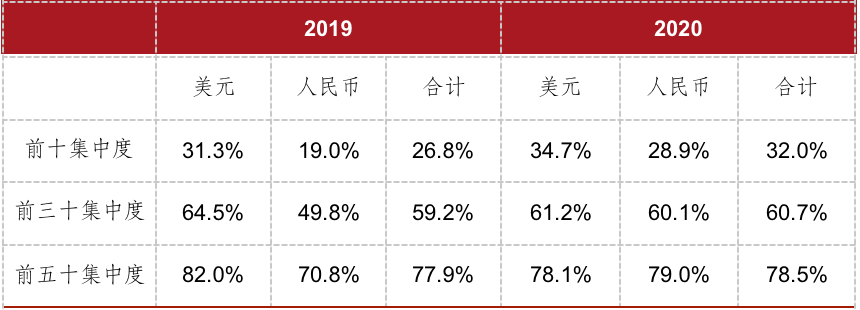 2020年前8月,前十發(fā)債集中度提升,人民幣債加權(quán)票息下降明顯。與銷售業(yè)績集中度提升的方向一致,資金向頭部房企集中以規(guī)避中小房企在調(diào)控中存在的各類不確定性風(fēng)險(xiǎn)。