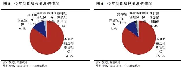 從增信情況來看,到期城投債中有819只為擔保債券,占到期城投債之比為12.95%,反映出大部分城投債沒有增信措施。其中,含有不可撤銷連帶責任擔保的債券694只,占含有增信措施城投債之比為84.7%,占據(jù)主導地位;連帶責任擔保債券14只,占比1.7%;保證擔保債券1只,占比0.1%;抵押擔保債券103只,占比12.6%;質押擔保債券4只,占比0.5%;質押擔保及抵押擔保債券3只,占比0.4%。