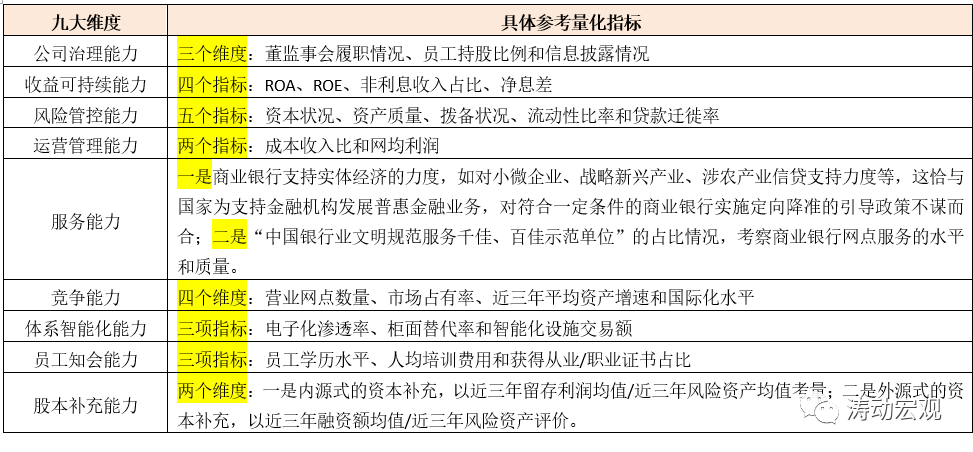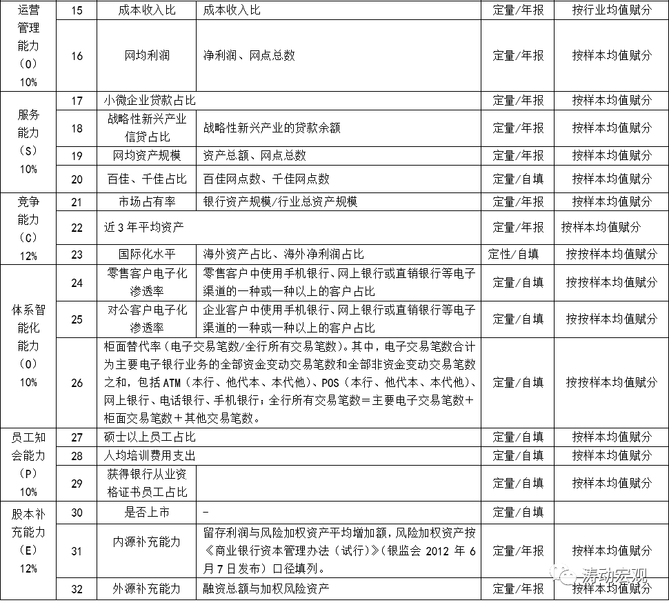 監(jiān)管評(píng)級(jí)之外,始于2015年的陀螺評(píng)價(jià)體系這里也略微提及一下。2013年中國(guó)銀行業(yè)協(xié)會(huì)成立課題組進(jìn)行研究,并于2015年正式推出“陀螺”(GYROSCOPE)評(píng)價(jià)體系,從公司治理能力(Governance)、收益可持續(xù)能力(Yield sustainability)、風(fēng)險(xiǎn)管控能力(Risk control)、運(yùn)營(yíng)管理能力(Operational management)、服務(wù)能力(Service quality)、競(jìng)爭(zhēng)能力(Competitiveness)、體系智能化能力(Organizational intellectualization)、員工知會(huì)能力(Personnel competence)、股本補(bǔ)充能力(Equity funding)等九個(gè)維度32項(xiàng)指標(biāo)入手,對(duì)全國(guó)性銀行與地方性銀行進(jìn)行綜合評(píng)價(jià)。不過(guò)這幾年,陀螺評(píng)價(jià)體系的影響力和受到的關(guān)注度有下降的趨勢(shì)。