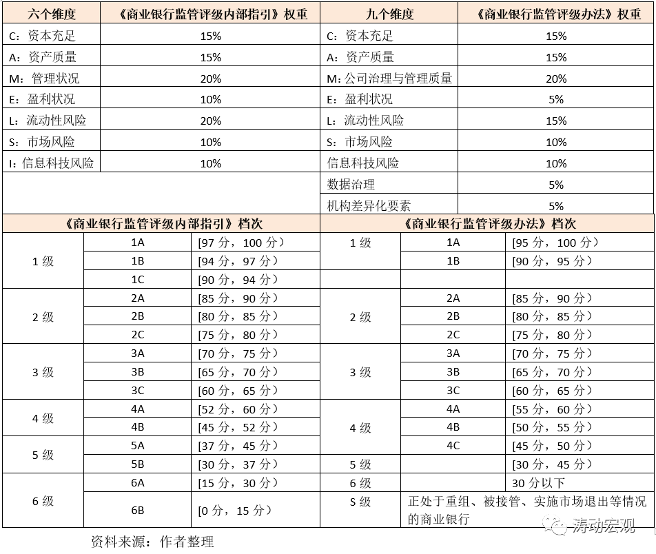 (2)商業(yè)銀行監(jiān)管評(píng)級(jí)充分借鑒了國(guó)際通用的“CAMELS+” 評(píng)級(jí)體系(即Capital adequacy、Asset quality、Management quality、Earnings、Liquidity、Sensitivity to market risk等六個(gè)英文單詞的首字母拼組),不過(guò)39號(hào)文在借鑒“CAMELS+”體系的基礎(chǔ)上,新增了數(shù)據(jù)治理維度和機(jī)構(gòu)差異化要素維度,并對(duì)相應(yīng)維度的權(quán)重進(jìn)行了調(diào)整。其中,39號(hào)文將盈利狀況和流動(dòng)性風(fēng)險(xiǎn)維度的權(quán)重分別下調(diào)5個(gè)百分點(diǎn)至5%和15%,保持資本充足、資產(chǎn)質(zhì)量、公司治理與管理質(zhì)量、市場(chǎng)風(fēng)險(xiǎn)、信息科技風(fēng)險(xiǎn)等五個(gè)維度的權(quán)重不變。