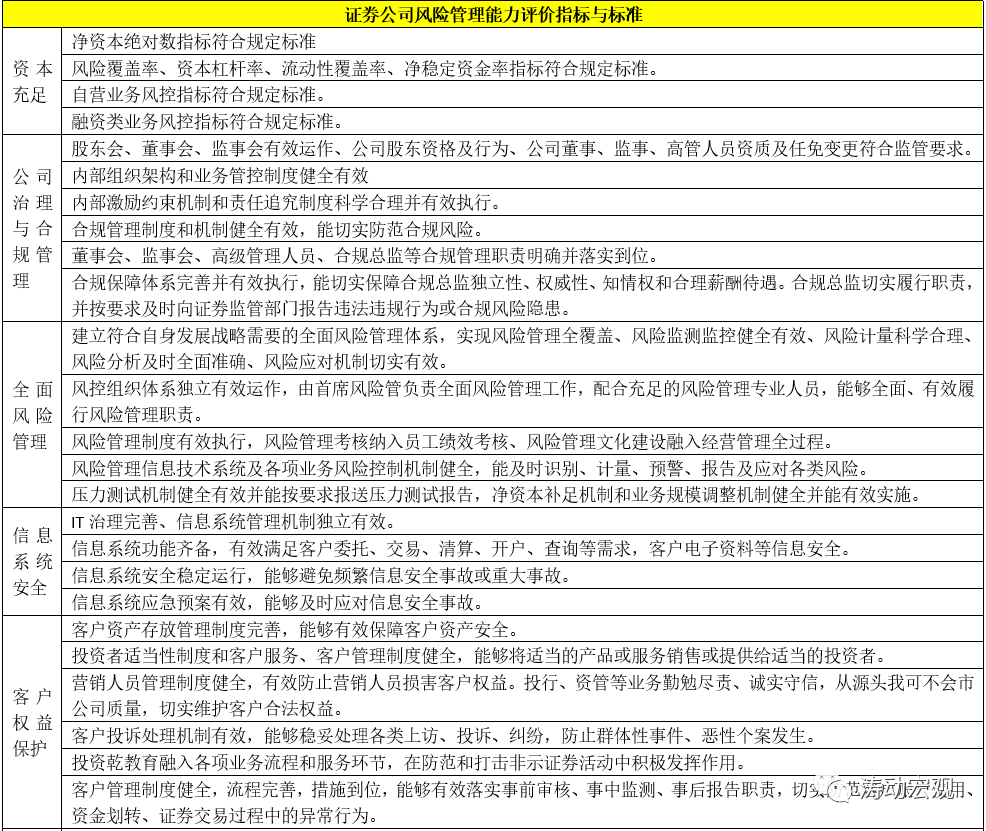 4、風(fēng)險(xiǎn)管理能力是證券公司評(píng)價(jià)體系的基礎(chǔ),主要包括資本充足、公司治理與合規(guī)管理、全面風(fēng)險(xiǎn)管理、信息系統(tǒng)安全、客戶權(quán)益保護(hù)、信息披露等方面。