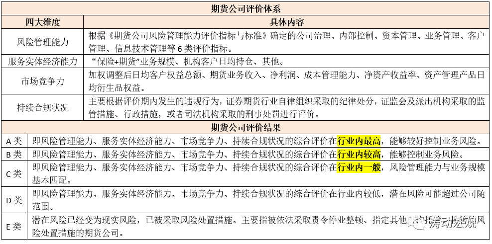 2、證監(jiān)會(huì)主要根據(jù)2019年2月15日修訂的《期貨公司分類監(jiān)管規(guī)定》(證監(jiān)會(huì)(2019)第5號(hào)公告),對(duì)期貨公司進(jìn)行評(píng)級(jí),事實(shí)上這一文件最早于2011年4月12日公布。同時(shí),期貨公司的評(píng)價(jià)標(biāo)準(zhǔn)仍以風(fēng)險(xiǎn)管理與控制能力為基礎(chǔ),主要依據(jù)《期貨公司風(fēng)險(xiǎn)管理能力評(píng)價(jià)指標(biāo)與標(biāo)準(zhǔn)》。