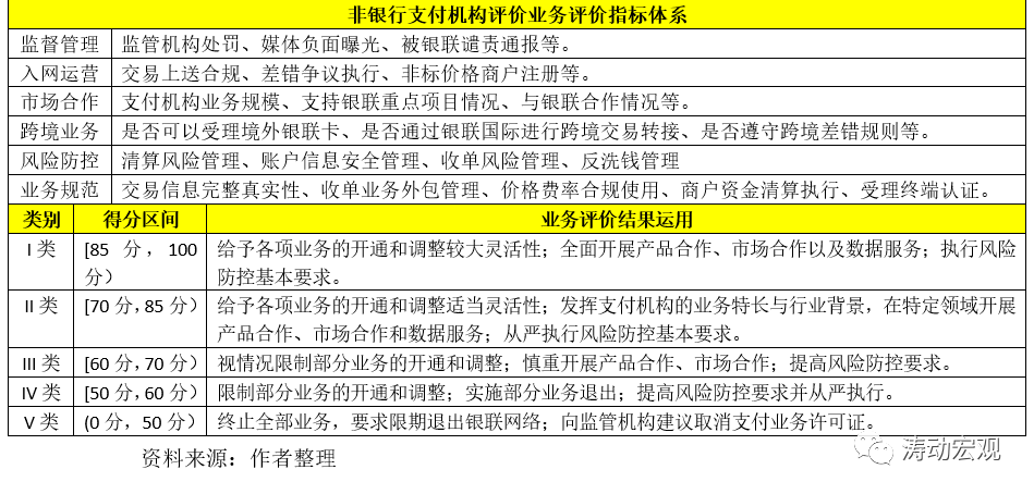 對(duì)非銀行支付機(jī)構(gòu)的評(píng)價(jià)主要依據(jù)2016年4月央行下發(fā)的《非銀行支付機(jī)構(gòu)分類評(píng)級(jí)管理辦法》以及2017年7月中國(guó)銀聯(lián)業(yè)務(wù)管理委員會(huì)發(fā)布的《銀聯(lián)網(wǎng)絡(luò)非銀行支付機(jī)構(gòu)業(yè)務(wù)評(píng)價(jià)辦法》(銀聯(lián)業(yè)管委(2017)6號(hào))。