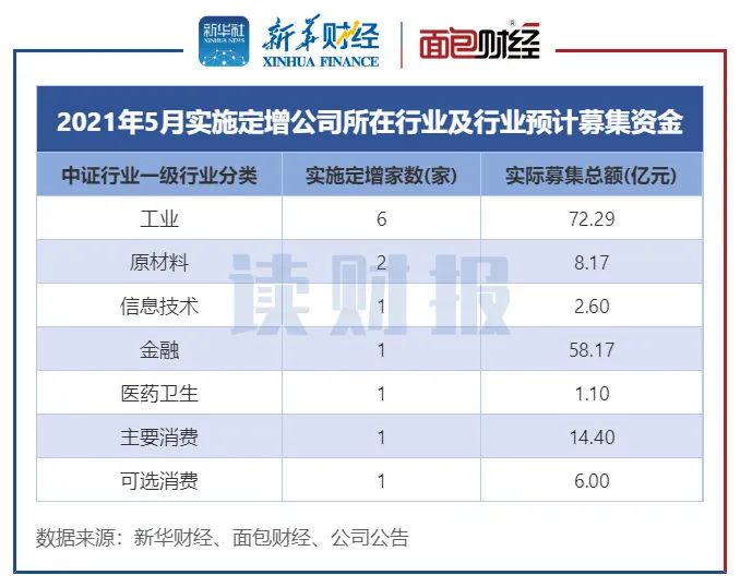 從行業分布來看,以中證行業統計,2022年5月,工業行業有6家上市公司實施定增,排在各行業之首;其次是原材料行業,有2家上市公司實施定增;其余行業均有1家公司實施定增。