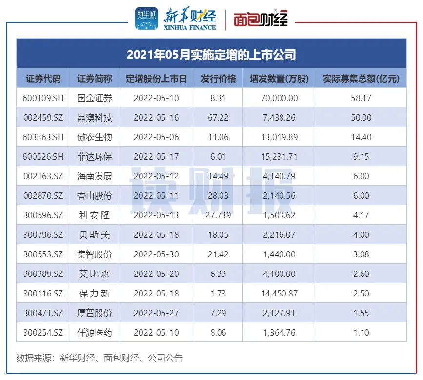 2022年5月實施定增的上市公司中,國金證券的實際募資總額排在首位。國金證券共發行約7億股,發行價格為8.31元/股,實際募集資金總額約58.17億元。發行對象包括成都交子金融控股集團有限公司、諾德基金管理有限公司、華夏基金管理有限公司等11家機構及個人投資者。其募集資金將全部用于增加公司資本金、補充營運資金及償還債務,用于擴展資本中介及證券投資業務,以及向全資子公司資增。