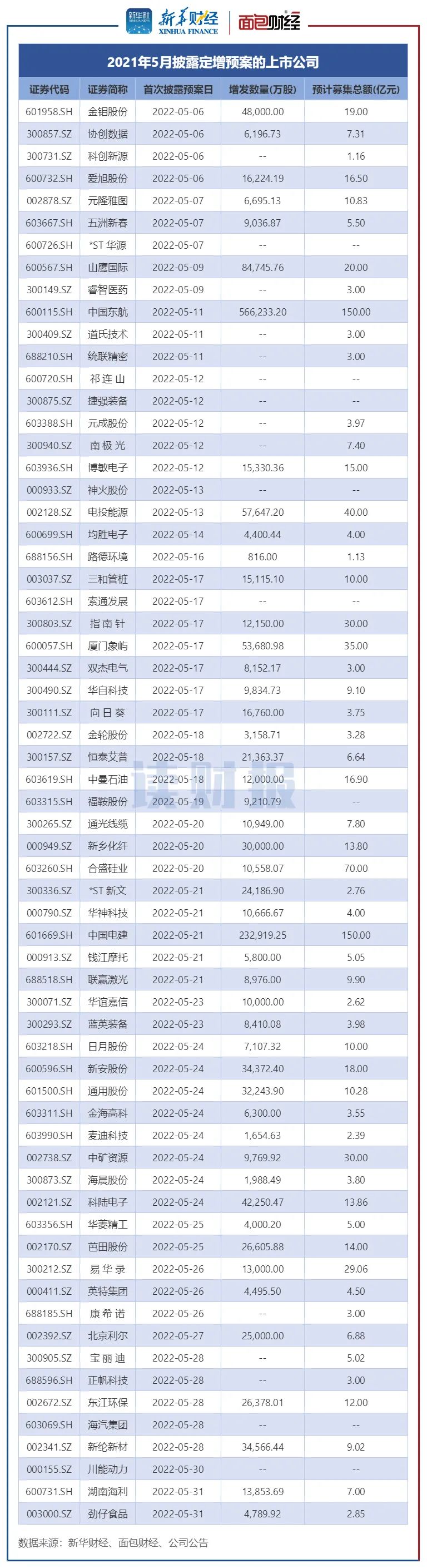 從單家公司來看,2022年5月份披露定增預案的公司中,預計募集資金規模最大的公司為中國電建及中國東航,兩家公司均擬募集資金不超過150億元。其中,中國電建擬發行不超過23.29億股,其募集資金用于粵港澳大灣區深圳都市圈城際鐵路深圳至惠州城際前海保稅區至坪地段工程1標(前保-五和)施工總承包項目、越南金甌1號350MW海上風電EPC項目、云陽建全抽水蓄能電站項目、海上風電施工安裝業務裝備購置項目、75米水深海上自升式勘測試驗平臺購置項目以及補充流動資金。中國東航擬發行不超過52.62億股,其募集資金用于引進38架飛機項目及補充流動資金。