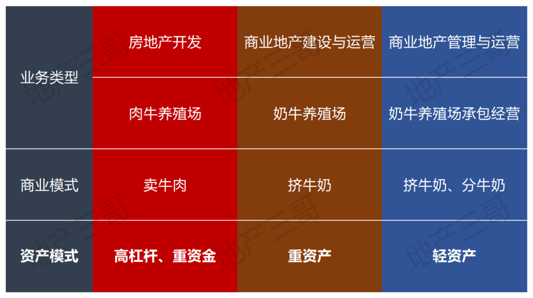 房地產開發,就是養肉牛的養殖場,然后賣牛肉,這是一次性的買賣,是高杠桿、重資金的業務。