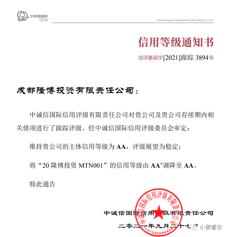 9月28日,中誠信國際公告稱,維持成都隆博投資有限責(zé)任公司(以下簡稱“隆博投資”)的主體信用等級為AA,評級展望為穩(wěn)定,將“20隆博投資MTN001”的信用等級由AA+調(diào)降至AA。