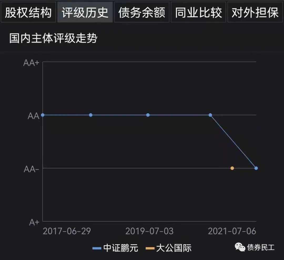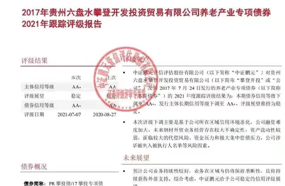 630跟蹤評級報告的關鍵期過去了,但是部分城投公司主體評級下調還在繼續。根據中證鵬元出具2021年7月7日出具的跟蹤評級報告,貴州六盤水攀登開發投資貿易有限公司(以下簡稱“攀登開投”)的主體評級由AA下調至AA-。