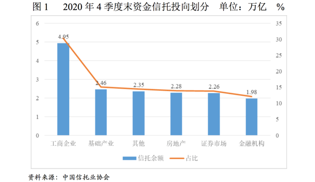 從目前信托資金投向來看,除卻工商企業(yè)外,城投和房地產(chǎn)行業(yè)是信托資金流向規(guī)模較大的兩個行業(yè)(如下圖1)。2021年初以來,監(jiān)管層陸續(xù)出臺針對房地產(chǎn)和城投企業(yè)的融資監(jiān)管政策或窗口指導(dǎo)意見,繼續(xù)強(qiáng)調(diào)嚴(yán)控資金投向房地產(chǎn)領(lǐng)域,嚴(yán)控投向城投的隱形債務(wù)增量。此次融資類信托的收緊,進(jìn)一步限制了兩大行業(yè)的再融資渠道,加大了行業(yè)信用風(fēng)險。