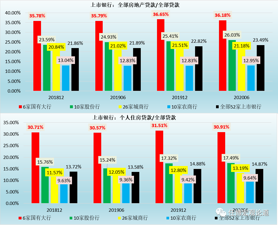 (1)截至2020年6月,6家國有大行的房地產貸款占比高達36.18%,2018年與2019年分別為35.78%和36.65%,整體上一直保持36%上的高位。