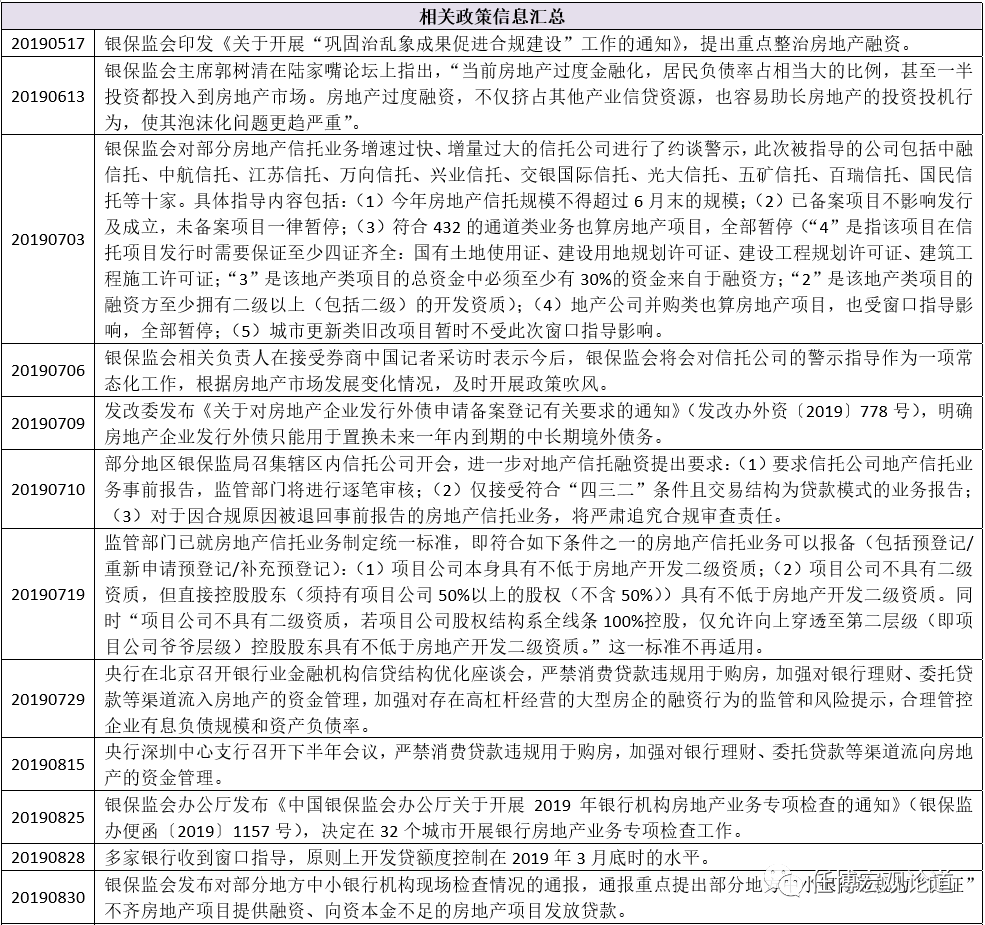 2、2019年政策層面對房地產業務的嚴監管始于中美貿易摩擦形勢開始明顯惡化(2019年5月5日)、包商銀行被接管以及貨幣政策層面再次放松之后,而2019年6月13日銀保監會主席郭樹清在陸家嘴論壇上提示房地產金融業務風險這一事件則正式拉開了房地產行業嚴監管的大幕,隨后整個7月份的房地產政策監管信息便比較集中,主要體現在房地產信托融資、房企境外發債等等。