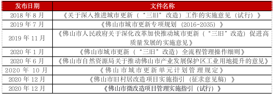 2018年,佛山發(fā)布《關于深入推進城市更新(“三舊”改造)工作的實施意見(試行)》,再度著重推進城市更新發(fā)展。2019年,在省政府等一系列文件的出臺支持下,佛山陸續(xù)推出了多項規(guī)劃和實施規(guī)范文件,加速城市更新發(fā)展。