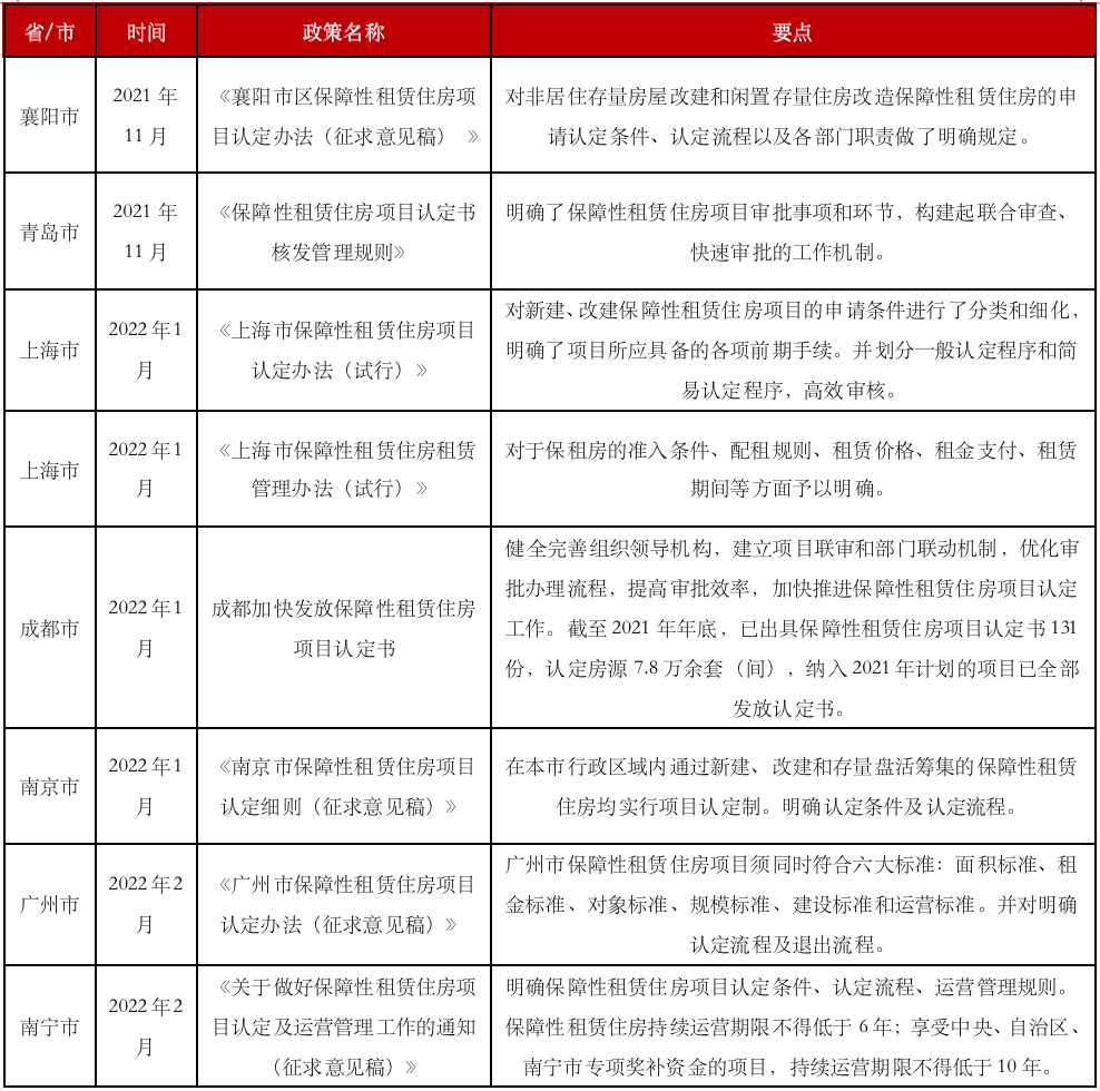 為加快保租房籌建進(jìn)度和規(guī)范保租房市場(chǎng)健康穩(wěn)定發(fā)展,上海、廣州、南京、青島等城市陸續(xù)發(fā)布保障性租賃住房項(xiàng)目認(rèn)定辦法與管理辦法,明確保障性租賃住房項(xiàng)目準(zhǔn)入條件、運(yùn)營(yíng)標(biāo)準(zhǔn)、退出規(guī)則以及審批事項(xiàng)和環(huán)節(jié)等,構(gòu)建聯(lián)合審查、快速審批的工作機(jī)制,確保“十四五”保障性租賃住房目標(biāo)按時(shí)保質(zhì)保量完成。