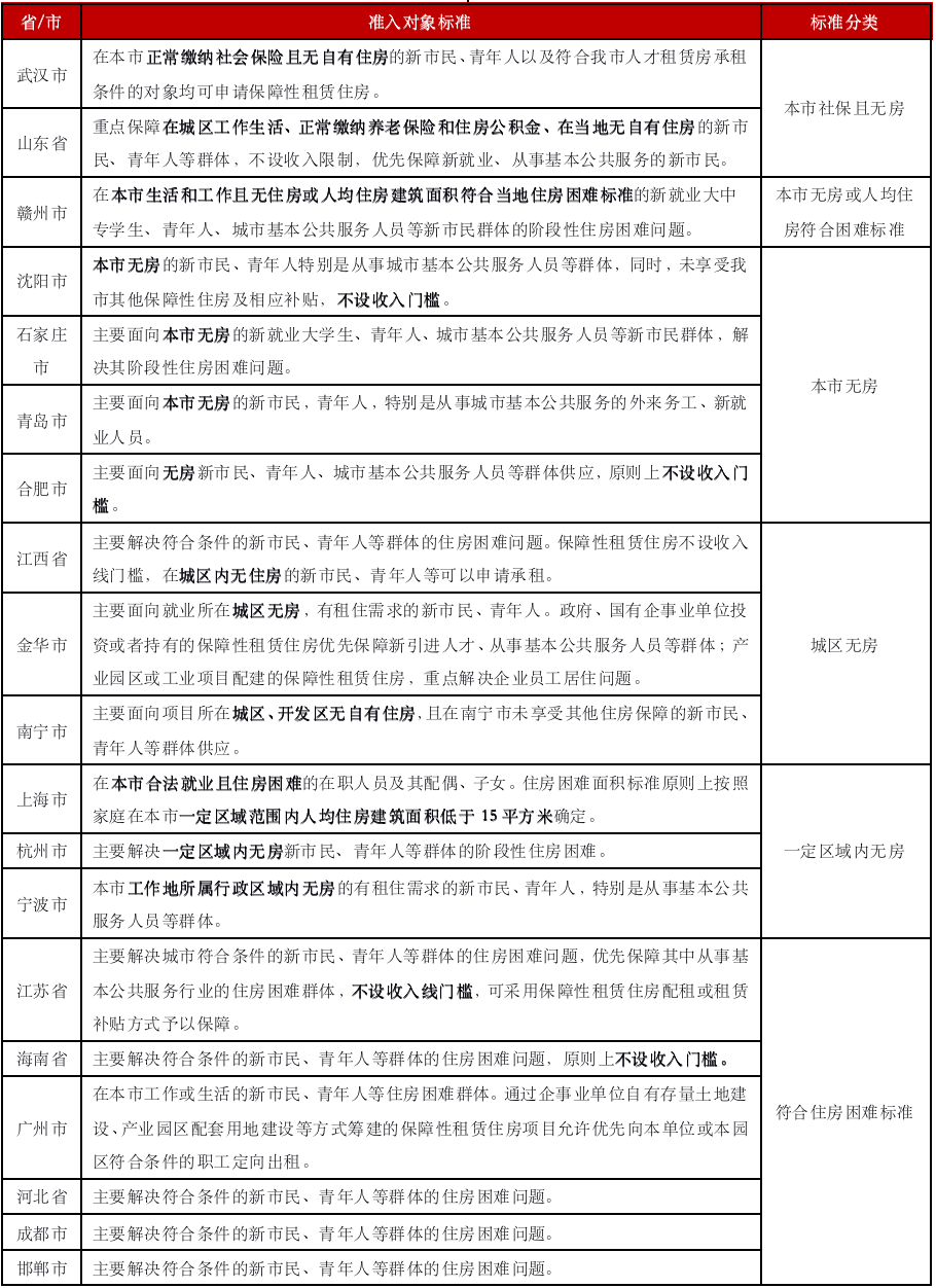 對(duì)象標(biāo)準(zhǔn):關(guān)于保障性租賃住房準(zhǔn)入對(duì)象上各城市存在較大差異,具體可以分為本市社保+無房、本市無房、城區(qū)無房、一定區(qū)域內(nèi)無房、符合住房困難標(biāo)準(zhǔn)五大類。