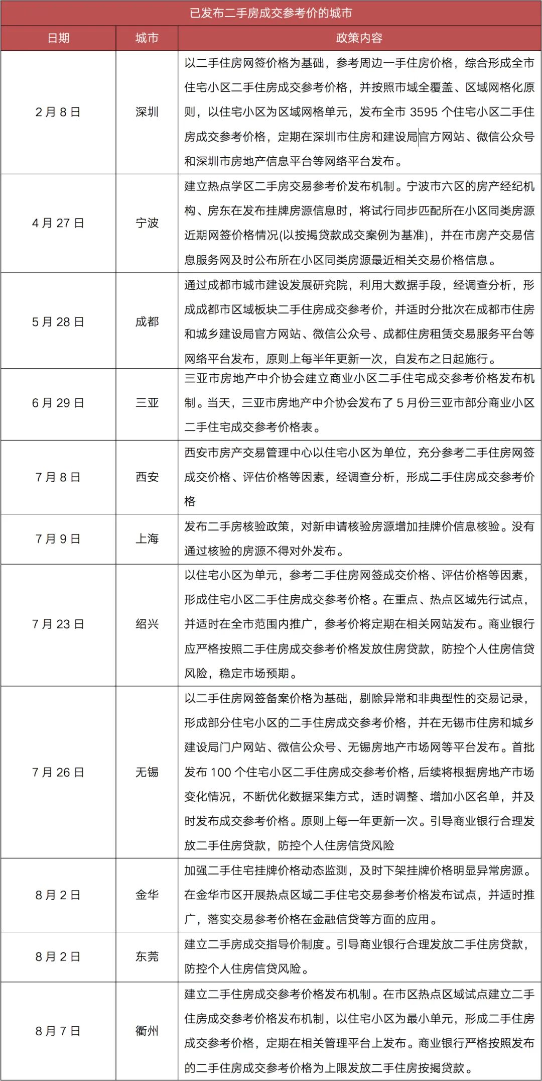 自7月23日住建部8部門發文以來,跟進升級調控的城市中,紹興、金華、東莞、衢州明確了建立二手住房成交參考價格發布機制,商業銀行嚴格按照發布的二手住房成交參考價格為上限發放二手住房按揭貸款。