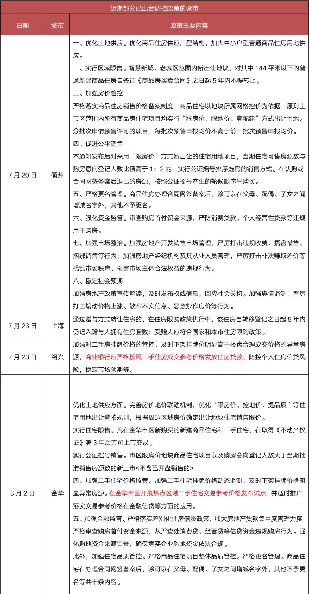 附圖:7月23日以來部分發布調控政策的城市及內容