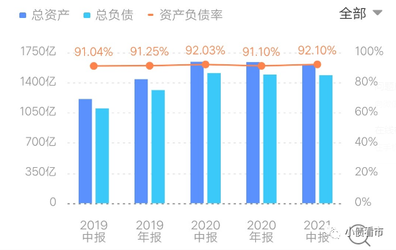 截至2021年6月末,建業(yè)地產(chǎn)總資產(chǎn)為1613億元,總負債1486億元,凈資產(chǎn)127.5億元,資產(chǎn)負債率高達92.1%。