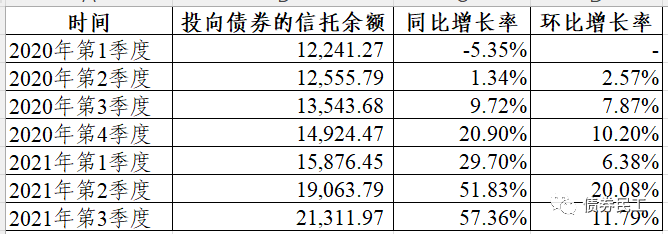 2021年12月1日,中國信托業協會公布了2021年3季度末信托公司主要業務數據。債券民工關注到了一個數據,信托產品投向債券的規模為2.13萬億元,同比增長分別為57.36%!這個增長速率高的有點嚇人。