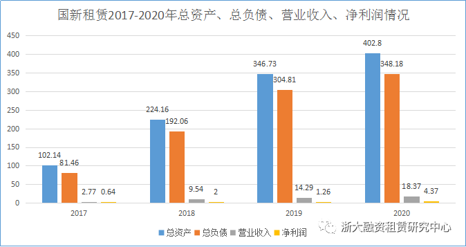 圖:國新租賃2017-2020年資產(chǎn)、負債、營業(yè)收入、凈利潤情況