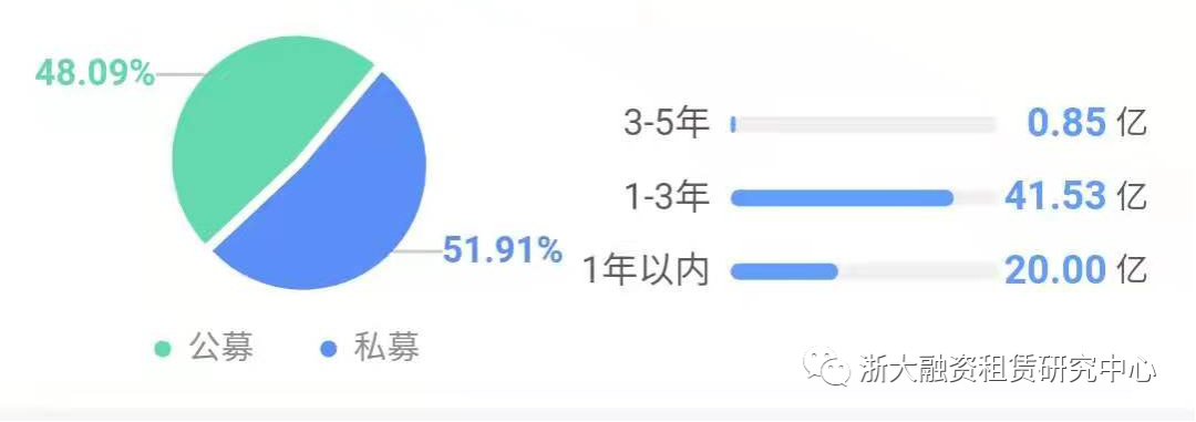 截至2021年7月31日,國新租賃債券存量規(guī)模62.38億元,債券10只。其中,私募債32.38億元,占比51.91%。