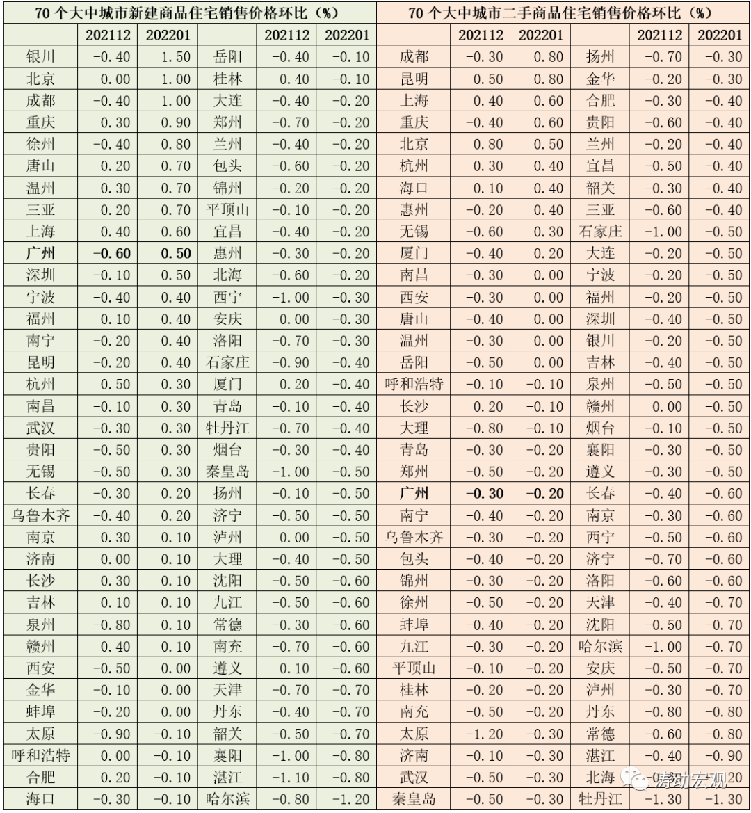 二、如果將廣州地區(qū)下調(diào)房貸利率和今年國(guó)家統(tǒng)計(jì)局發(fā)布的一組數(shù)據(jù)結(jié)合在一起理解則會(huì)更有意思。2022年2月21日,國(guó)家統(tǒng)計(jì)局發(fā)布2022年1月份70個(gè)大中城市商品住宅銷售價(jià)格變動(dòng)情況,具體數(shù)據(jù)如下: