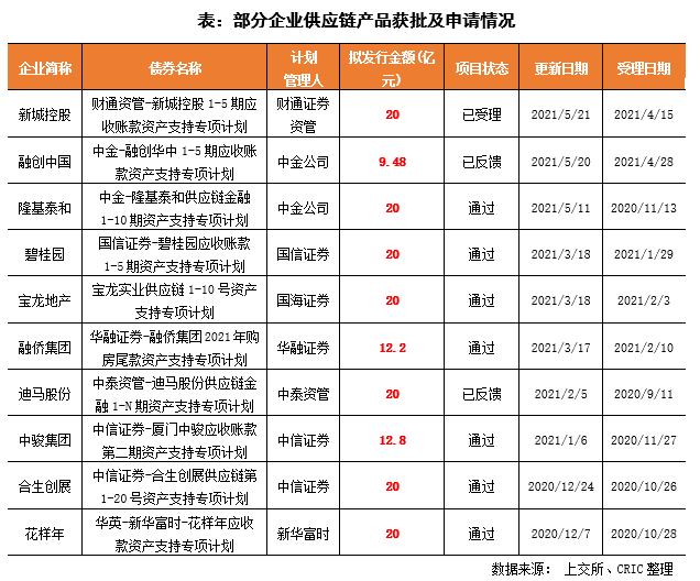 在2020年監(jiān)管窗口指導(dǎo)中,保理形式的資產(chǎn)證券化產(chǎn)品申請(qǐng)儲(chǔ)架發(fā)行,制造業(yè)企業(yè)ABS儲(chǔ)架額度最高可到100億元,房地產(chǎn)供應(yīng)鏈類ABS儲(chǔ)架規(guī)模被降至20億元,且新申請(qǐng)儲(chǔ)架發(fā)行已經(jīng)很難獲批。該窗口指導(dǎo)在企業(yè)的申請(qǐng)情況中可以窺見,根據(jù)上交所備案數(shù)據(jù),近期房地產(chǎn)企業(yè)申請(qǐng)的供應(yīng)鏈產(chǎn)品額度最高為20億元,碧桂園、隆基泰和、寶龍等近期通過的供應(yīng)鏈資產(chǎn)支持計(jì)劃額度均為20億元。