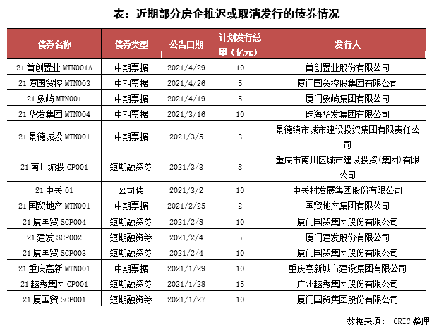 與此同時(shí),2020年以來企業(yè)信用債暴雷頻發(fā),且逐步波及到排名較前的中大型房企,從而引發(fā)債券市場(chǎng)動(dòng)蕩。截止2021年5月26日,房企債券違約金額約達(dá)296.78億元,較2020年增長(zhǎng)56%,在此情況下,疊加融資收緊的政策壓力,債券市場(chǎng)近期較為動(dòng)蕩,首創(chuàng)、廈門國(guó)貿(mào)等近期取消了多筆中期票據(jù)以及融資券的發(fā)行,企業(yè)信用債融資也受到較大的影響。而海外融資受近期境內(nèi)債違約、美元上調(diào)、海外疫情等多重因素的影響,房企境外發(fā)債較少,截止4月底的發(fā)行量占總債券的48%,比2020年同期低潮期還低2個(gè)百分點(diǎn)。