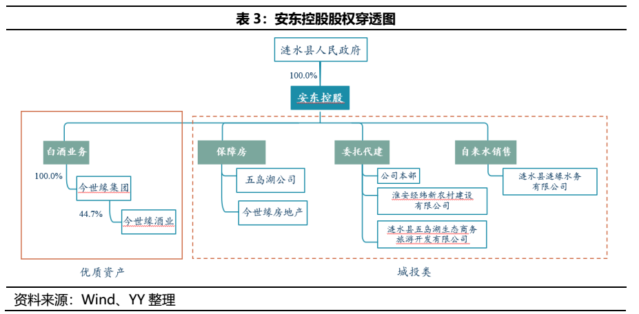安東控股通過今世緣集團間接持股今世緣44.74%的股份,實控人為漣水縣人民政府。主營業務可以分為白酒和城投兩大板塊,城投業務主要包括保障房、委托代建和自來水銷售,其中母公司主要負債委托代建。