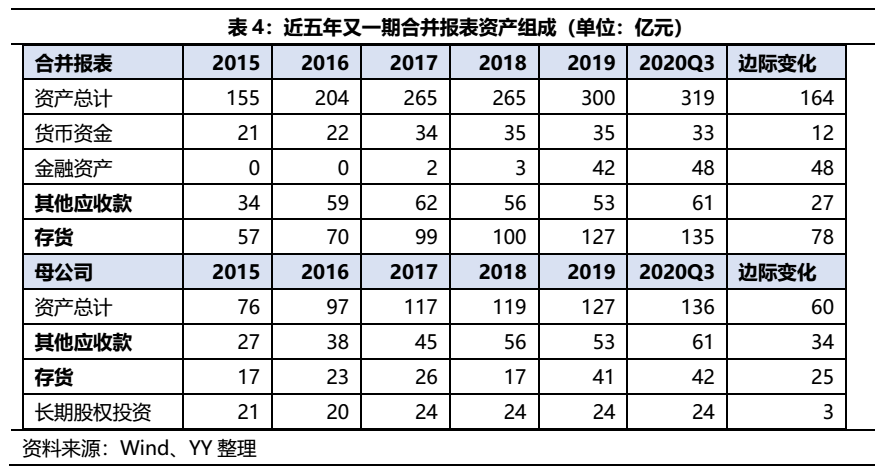 2015到2020Q3,從資產端來看,母公司主要的變動科目是其他應收款和存貨,分別增加了34億元和25億元,對應負債端,主要是其他應付款和有息負債,分別為28億元和24億元。