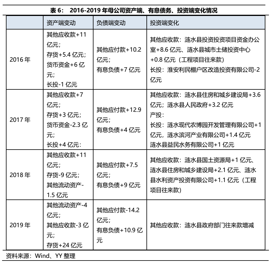 母公司的主要資產構成中,存貨主要系工程施工項目未結轉成本,資金占用量大且回款不明,其他應收款主要債務人為漣水縣政府部門,而長期股權投資則主要是公司持有的今世緣股份,母公司主營工程施工業務,承擔了漣水縣內許多基礎設施建設項目,因此公司近年來資金主要流向了城投業務。