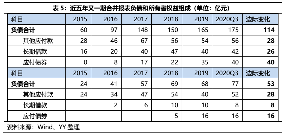 因此,無論從負債端還是資產端,由于白酒股權對報表的美化作用,母公司的報表更為獨立,故下文將進一步追溯母公司近五年的報表組成,分析公司的舉債和資產形成過程。