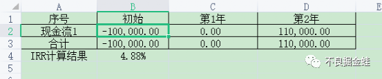 例如,某貸款產品,期限為2年,本金為10萬元,2年后借款人一次性還本付息11萬元。上述貸款的年化利率約為4.88%,計算過程為:100000=110000/(1+IRR)2。這類金融產品先對計算簡單,一旦年限較長其實計算也比較麻煩。如何簡單計算出IRR結果呢?