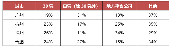 第三類城市的租賃用地出讓分布相對均衡,包括廣州、杭州、福州合肥等。此類城市吸引的房企類型相對多元化,且廣州本土的越秀、杭州本土的濱江、綠城等已經發展為百強甚至30強房企,此類房企積極布局大本營,也降低了本土平臺公司托底的“壓力”,最終租賃用地的分布也更加均衡。