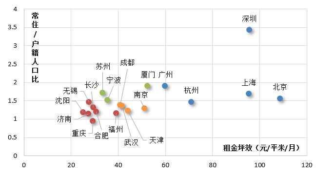 外來人口是城市發展租賃用房的根基,對租賃住房的需求量、價格均有較大的影響,常住戶籍人口比越大的城市,外來人口越多,租賃市場潛力越大;另一重要因素則是租金,租金越高的城市,對于房企而言租賃資產更加優質。
