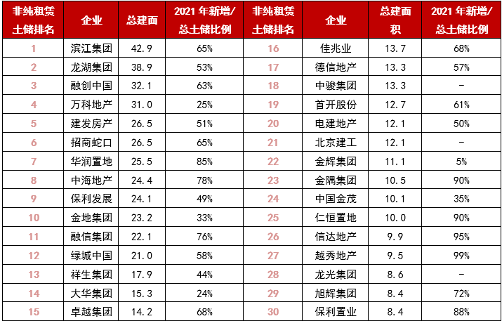 表:2017-2021年百強房企22城非純租賃用地總土儲TOP30
