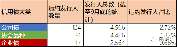 用違約發(fā)行人數(shù)量作為分子,發(fā)行人數(shù)量作為分母,也是個(gè)不錯(cuò)的的對(duì)比口徑,現(xiàn)在發(fā)行過公司債、協(xié)會(huì)品種和企業(yè)債的發(fā)行人數(shù)量大概分別是4566、4426和2564家,已經(jīng)正式宣告違約的發(fā)行人數(shù)量分別是124家、81家和17家。