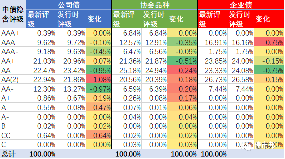 我們來看看,2021年發(fā)行的三大信用債品種(剔除SCP)的最新的隱含評(píng)級(jí)分布,以及與發(fā)行時(shí)候隱含評(píng)級(jí)變化的情況。