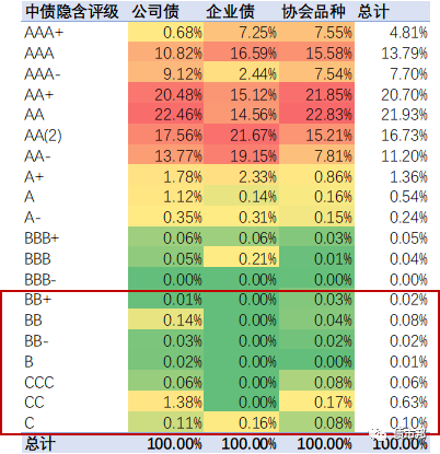 協(xié)會(huì)品種方面,AAA、AAA-和AA+的占比下滑了0.95%,而AA、AA(2)等較低隱含評(píng)級(jí)的占比顯著提升;