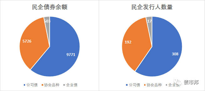 從存量上來看,民企發(fā)行人的數(shù)量是公司債(308家)>協(xié)會(huì)品種(192家)>企業(yè)債(17家);民企債券余額是公司債(9771億元)>協(xié)會(huì)品種(5726億元)>企業(yè)債(503億元)。