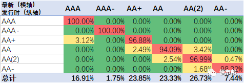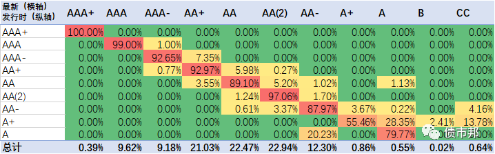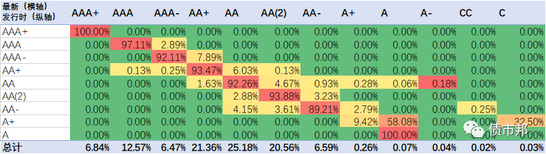 下面是2021年公司債券的隱含評(píng)級(jí)遷徙情況,橫軸為最新隱含評(píng)級(jí)情況,縱軸為發(fā)行時(shí)的隱含評(píng)級(jí)。